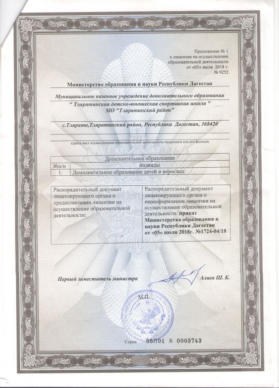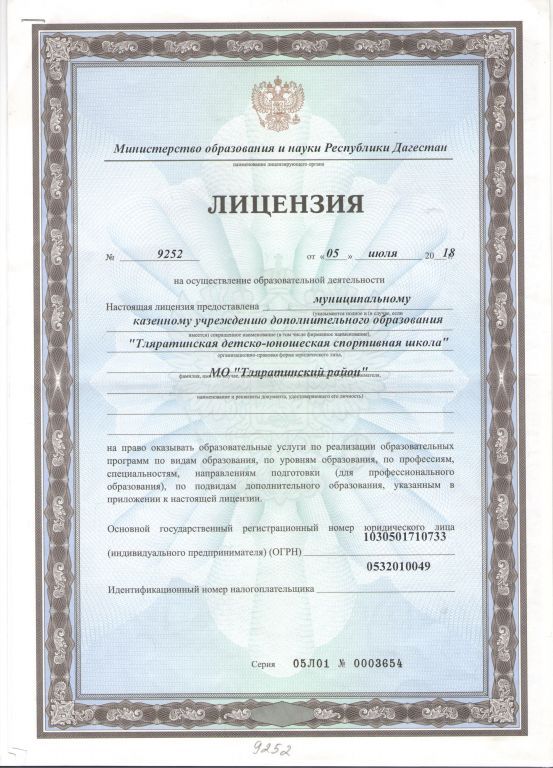 | Полное наименование образовательной организации* | МУНИЦИПАЛЬНОЕ КАЗЕННОЕ УЧРЕЖДЕНИЕ ДОПОЛНИТЕЛЬНОГО ОБРАЗОВАНИЯ "ТЛЯРАТИНСКАЯ ДЕТСКО-ЮНОШЕСКАЯ СПОРТИВНАЯ ШКОЛА" МО "ТЛЯРАТИНСКИЙ РАЙОН" |